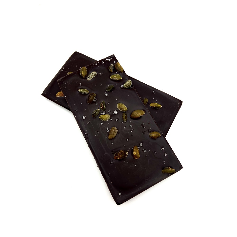 chocolat noir 70% de cacao aux éclats de pistache et sa fleur de sel